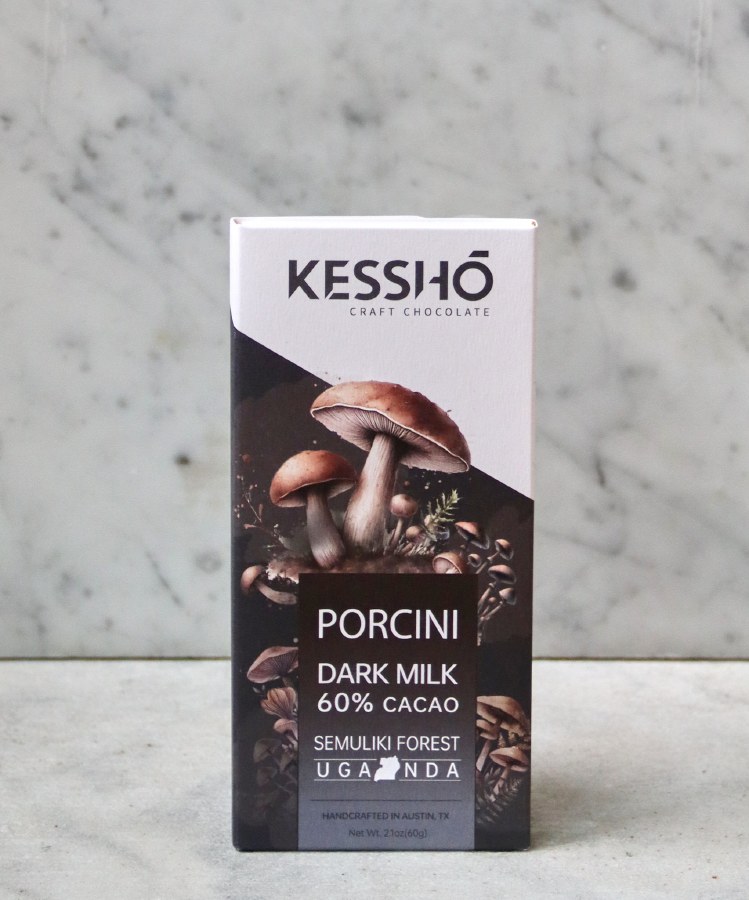 Foraged Yunnan porcini mushrooms lend their deep earthiness to this dark milk chocolate. They pair these prized mushrooms, with their nutty and umami notes, with 60% Ugandan cacao. The result is a silky chocolate that opens with caramel sweetness before revealing layers of forest floor, roasted nuts, and a savory depth.